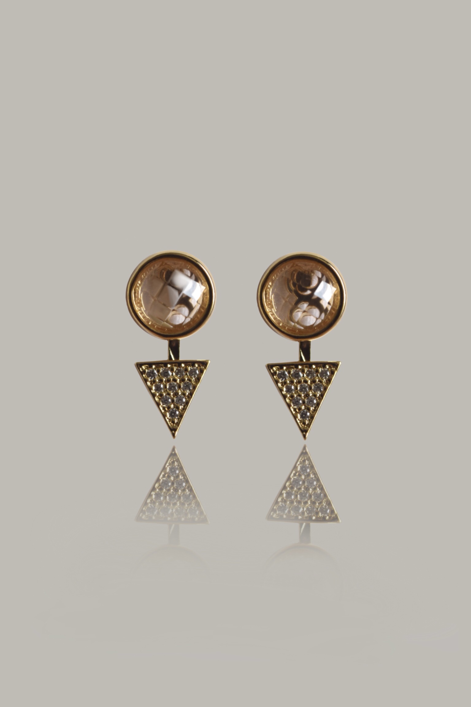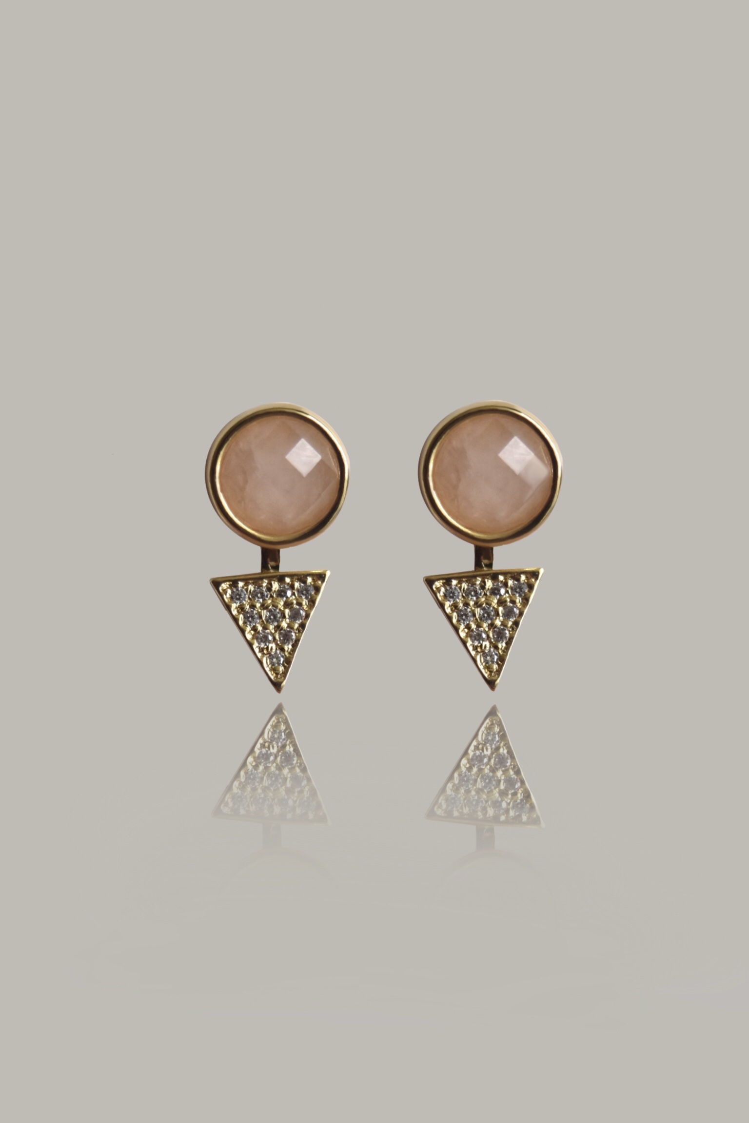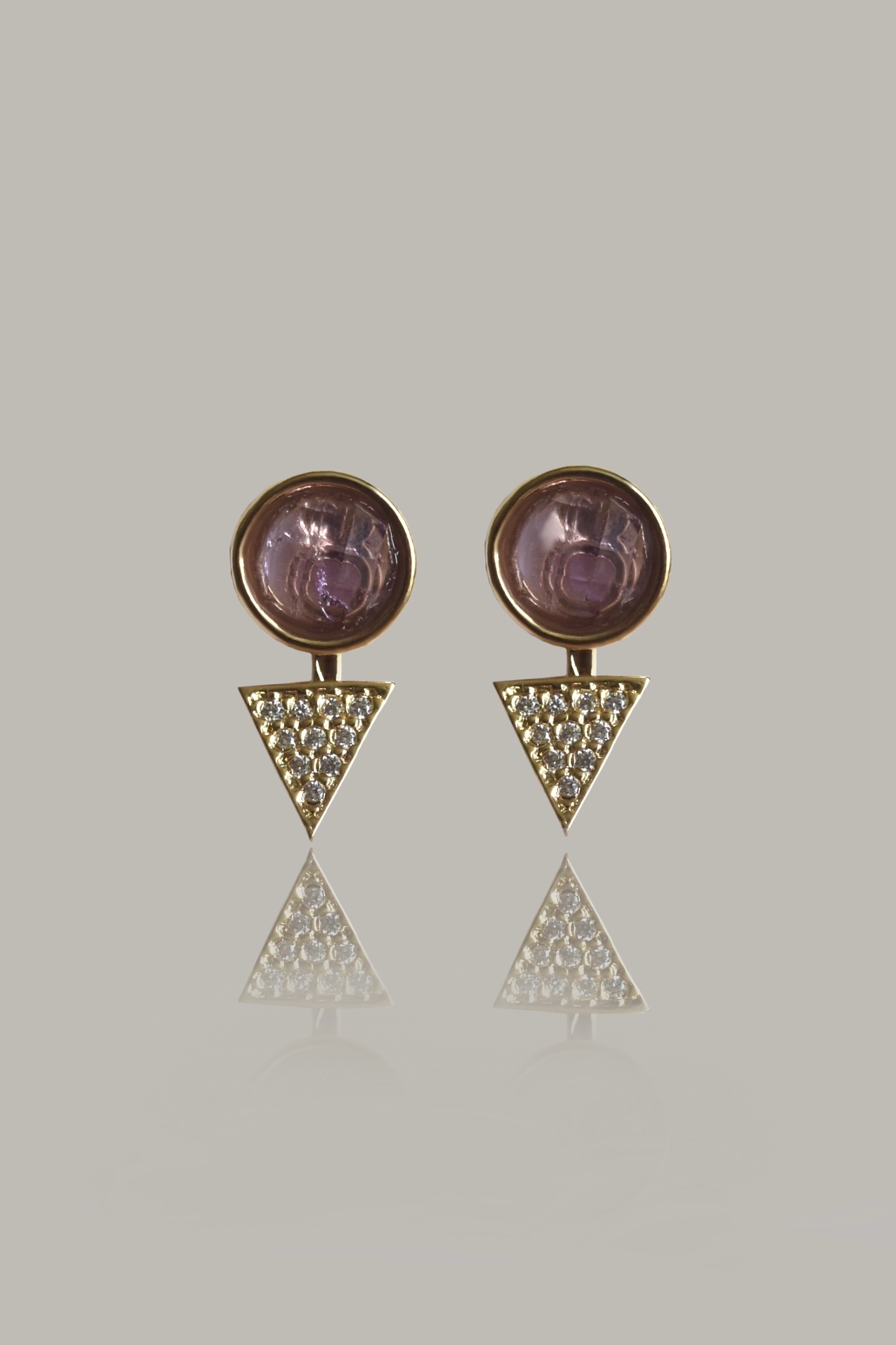 Aretes estilo botón vienen con la gema de tu elección y un acento de triángulo de pedrería removible. Lleve las propiedades curativas de estos cristales a donde quiera que vaya. Disponible en Amatista, Cuarzo Claro y Cuarzo Rosa facetadas con enchapado en oro de 22kt.