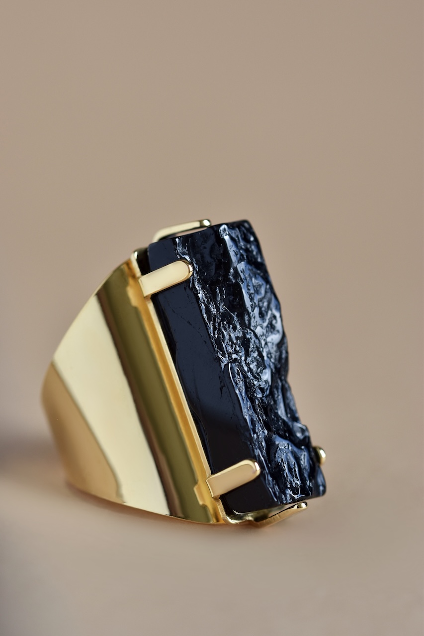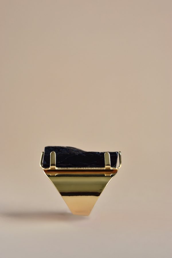 El Statement Ring muestra una sola piedra grande de Turmalina. Este audaz y hermoso anillo está diseñado con una banda chapada en oro.